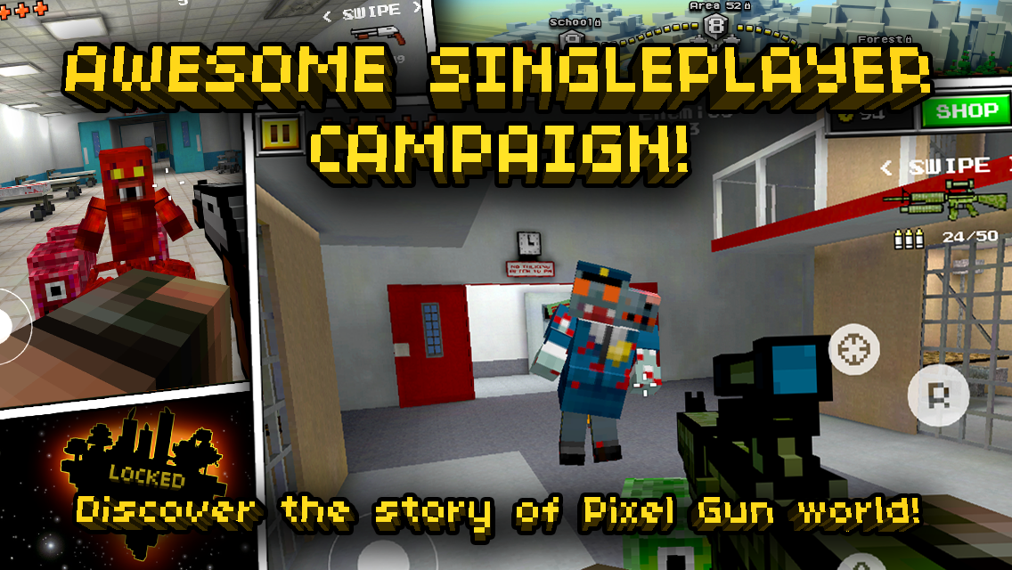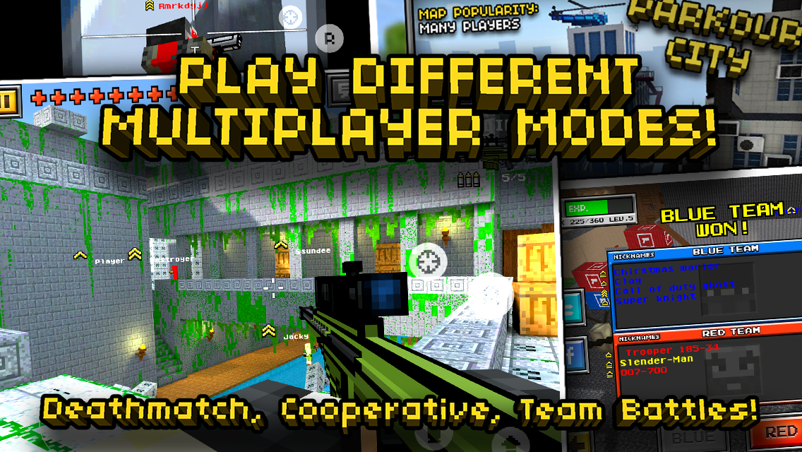 juega un sin numero de largos niveles con toda la accion que Pixel Gun 3D puede brindar, además gana monedas para comprar armas en el modo online.